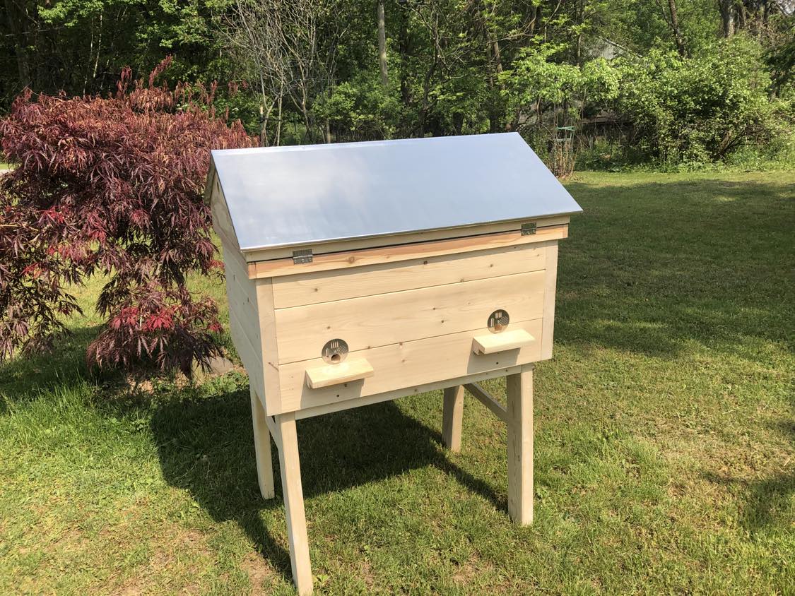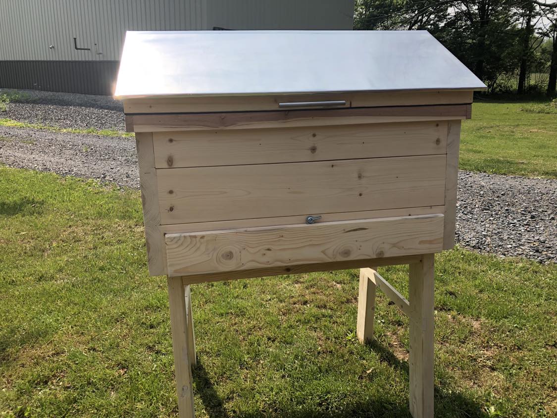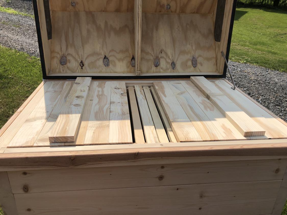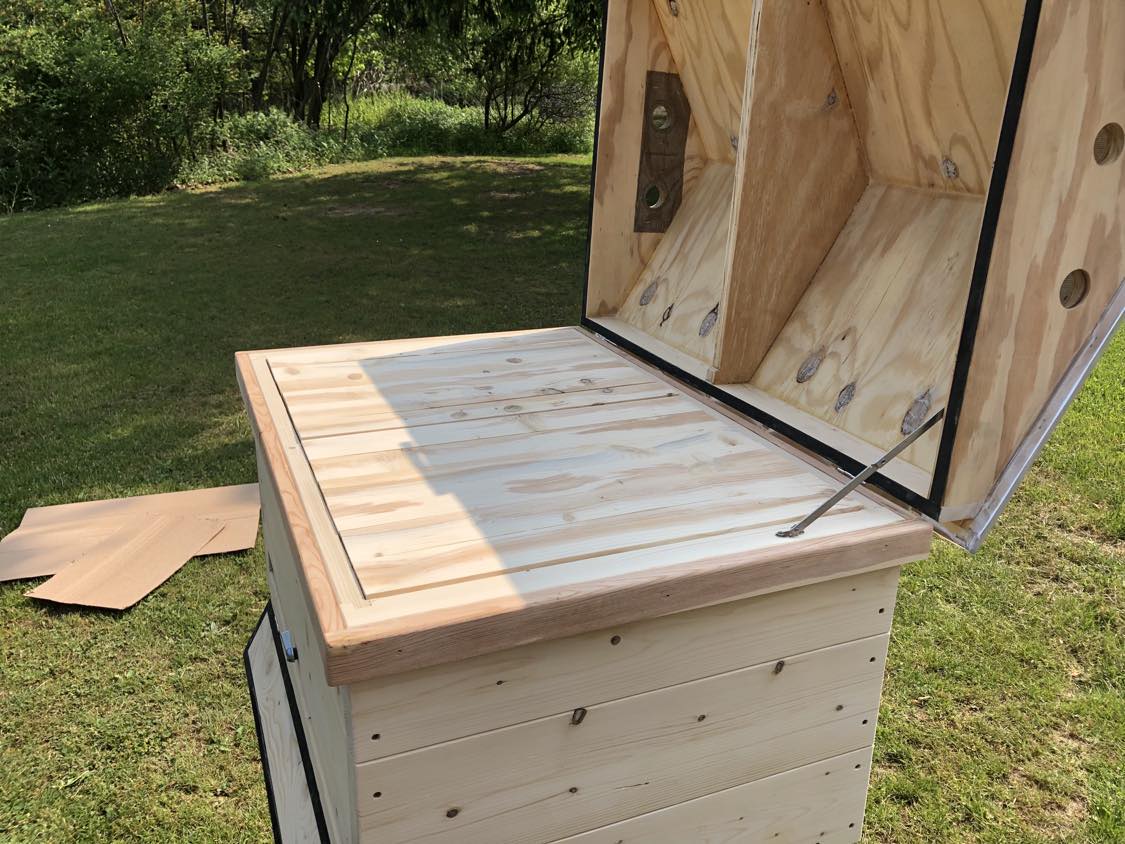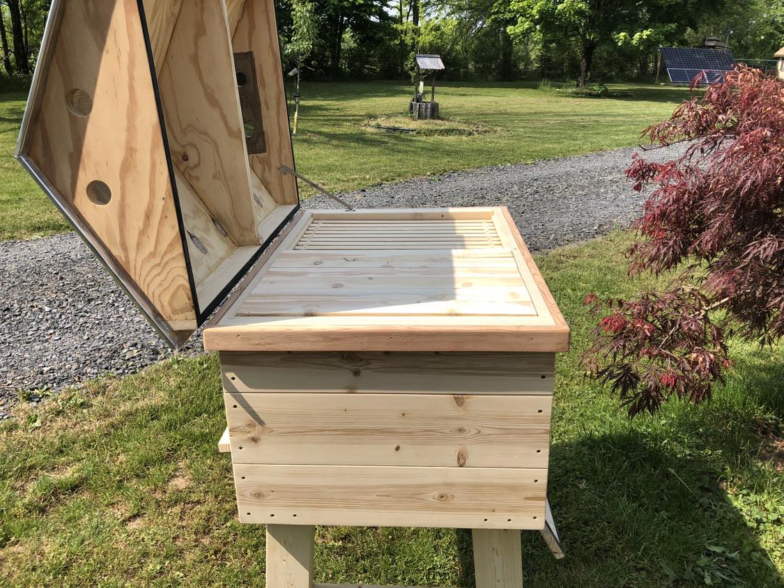 The top is made of a lighter plywood construction with a locking hinge so that you can check on your bees with minimal disruption.