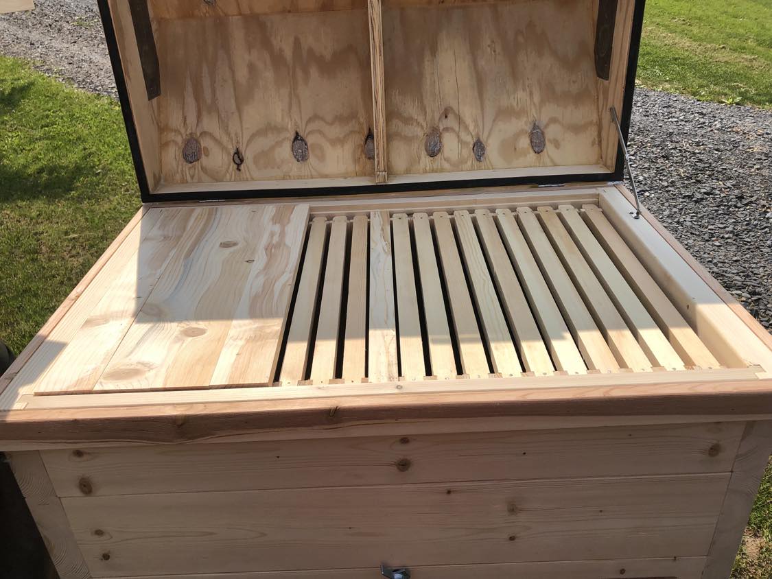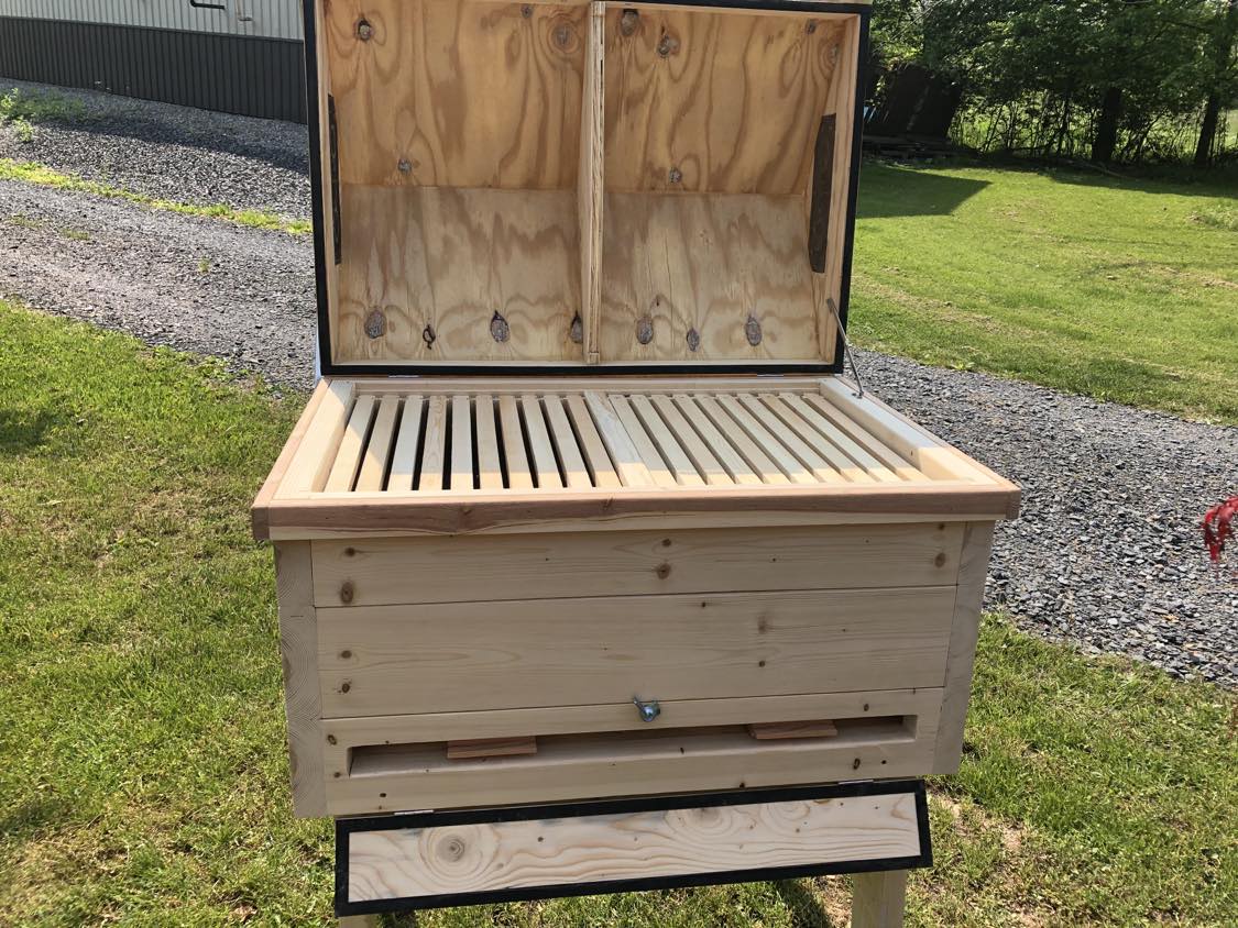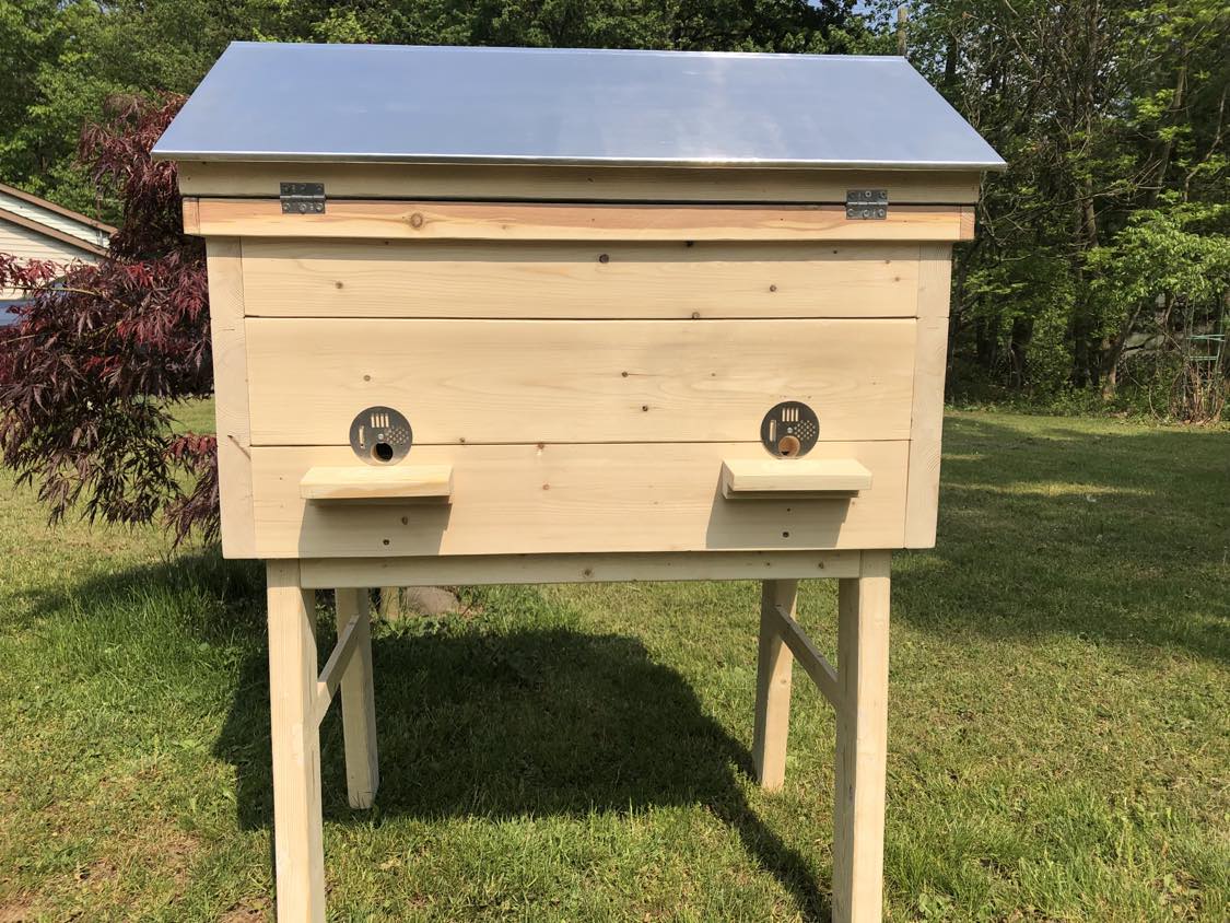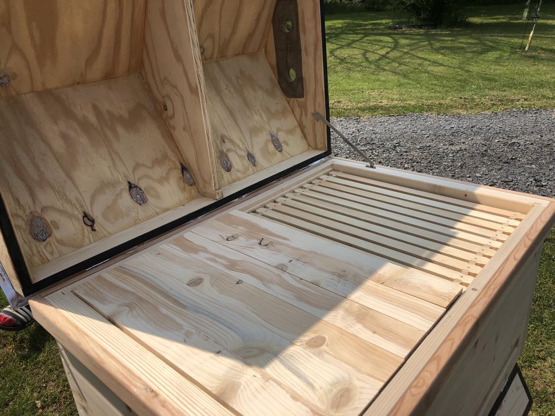 The top is made of a lighter plywood construction with a locking hinge so that you can check on your bees with minimal disruption.