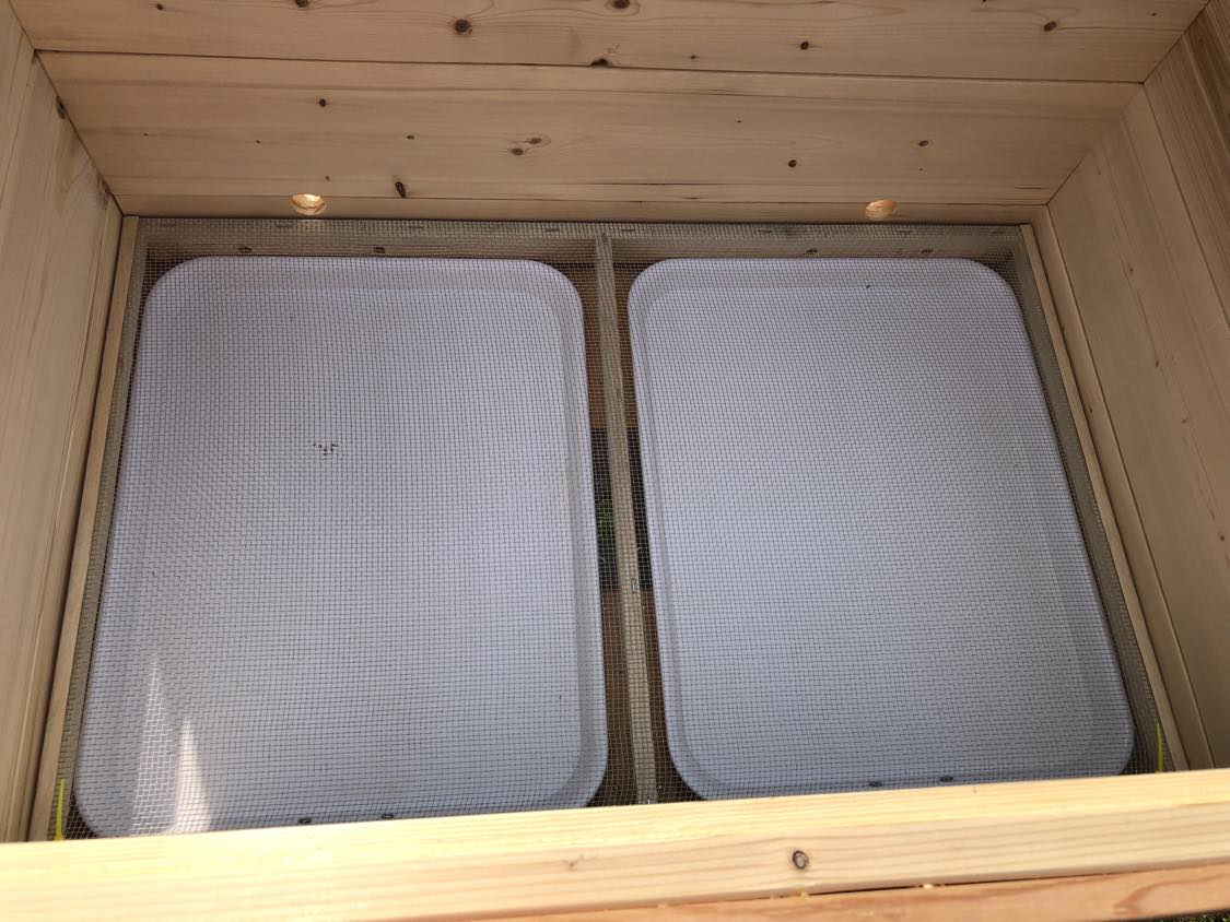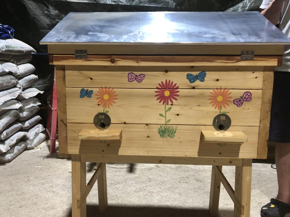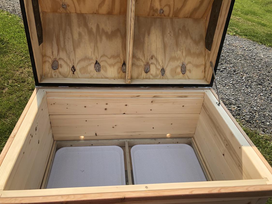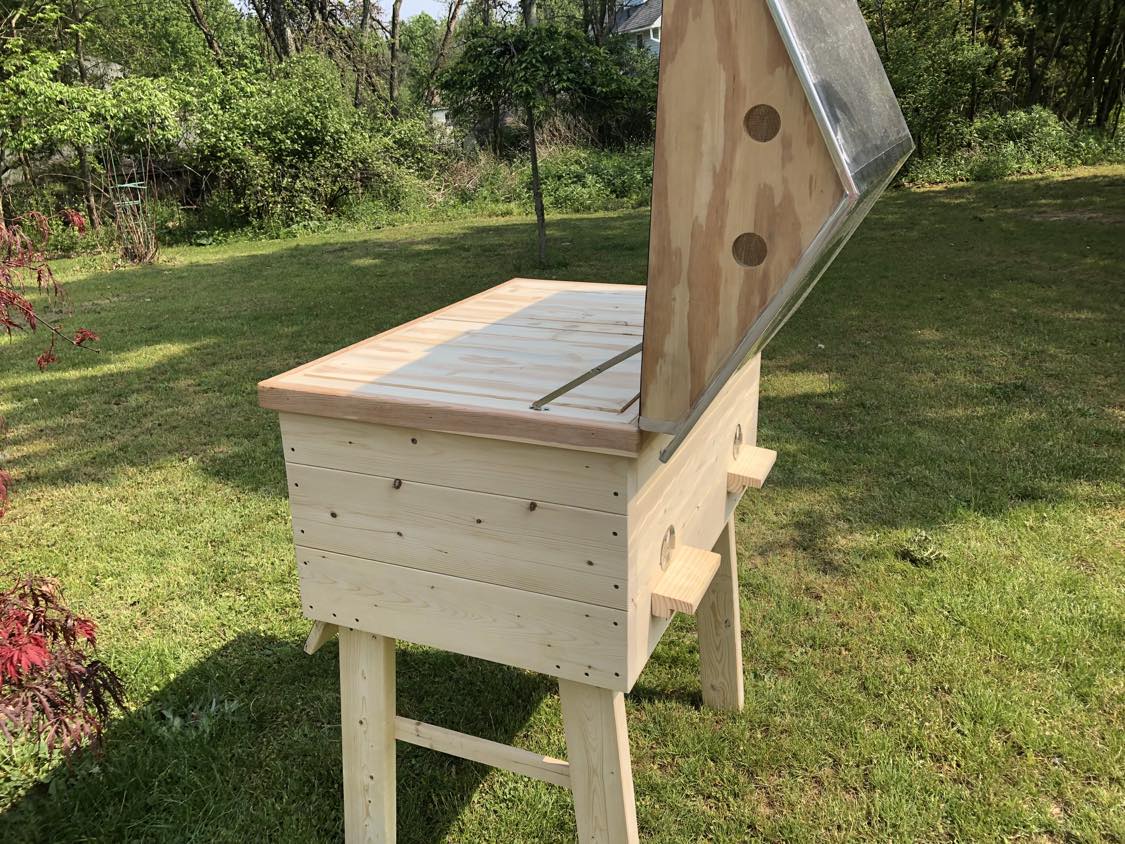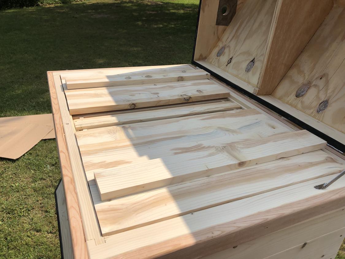 The top is made of a lighter plywood construction with a locking hinge so that you can check on your bees with minimal disruption.